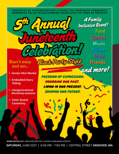 In partnership with the Town of Andover (Andover DIVERSE), the Andover Baptist Church and the South Church Social Justice Coalition will be hosting the 2nd annual, town-wide Juneteenth celebration on Saturday, June 18th at the Andover Robb Senior Center, 30 Whittier Ct. from Noon to 3 pm. Everyone, of all ages, is welcome.